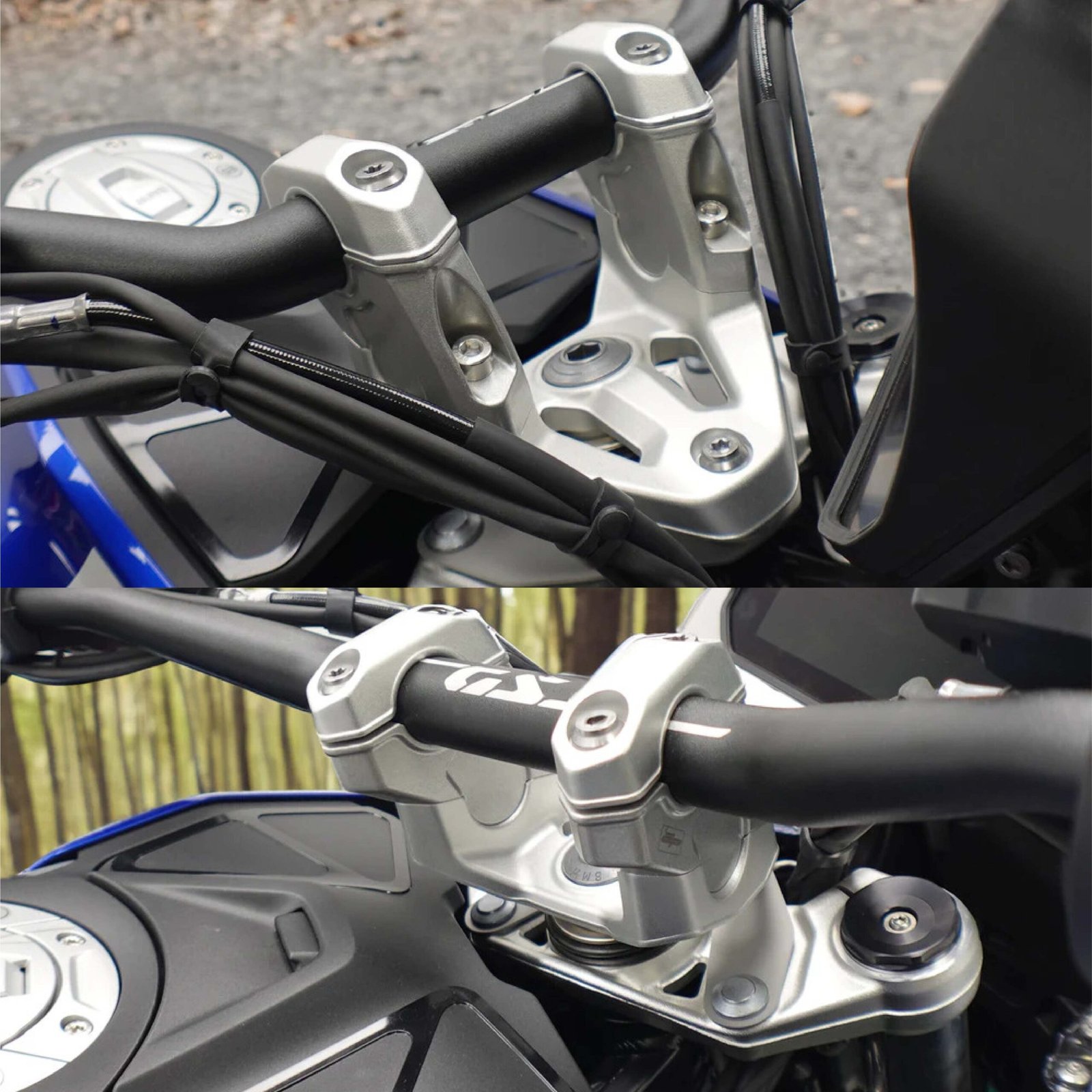 Evotech Offset Handlebar Risers for the BMW R 1300 GS are designed to elevate your riding experience. With a substantial 40mm lift and a convenient 30mm offset, EP’s bar risers offer a more comfortable riding position, reducing strain on your wrists and shoulders. The EP risers are crafted from high-quality aluminum and finished with a sleek silver powder coating to complement the BMW’s classic aesthetic.