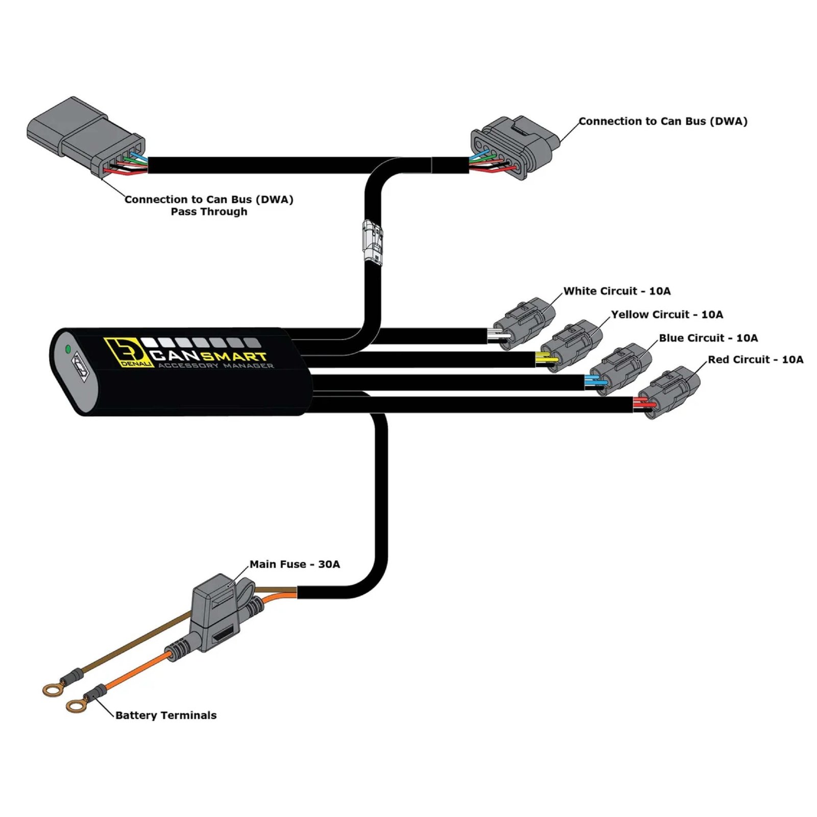 The CANsmart’s four circuits are preprogrammed to connect and independently control two sets of DENALI 2.0 lights, a SoundBomb horn, and our B6 auxiliary brake light.