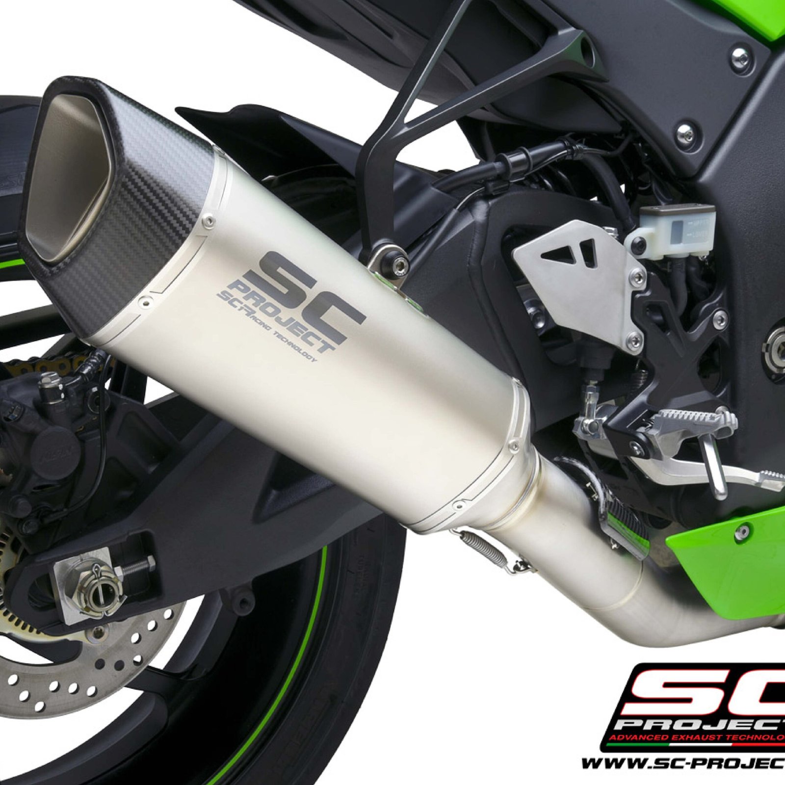 The muffler SC1-R is created and developed by the experience of the SC-Project racing department in the most important World Competitions. A look with taut and decided lines will enrich Your Kawasaki Ninja ZX-10R making it unique and exclusive. The exit pipe obtained by hydroforming and the carbon fiber end cap from the rhomboidal asymmetric shape make inimitable the silencer SC1-R. The lightweight outer body is available in both Titanium version. The weldings with T.I.G., the sound-absorbing material resistant to very high temperatures and the insert bushings made in CNC machining embellish the SC1-R silencer. In the version with Titanium body the R&D department of SC-Project wanted to make the SC1-R more elegant by imprinting the Logo by laser, without distorting the look. In the kit are included the full titanium link pipe and the carbon heat protection.