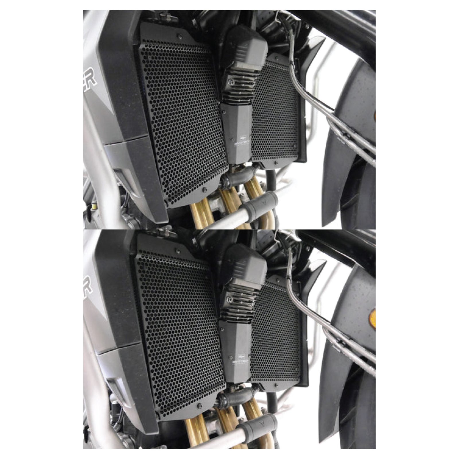Evotech Radiator Guards are designed by motorcycle-owning engineers who value quality and precision. The end result is that all EP components fit precisely and work perfectly at protecting the Triumph Tiger 900 GT Pro dual-radiators from damage caused by road / off-road debris (stones, mud, dropped waste etc), while at the same time allowing cool air to pass through. The radiators’ thin, soft aluminium cooling fins and internal cores are very susceptible to being hit or holed by debris that can be picked up by the front tyre or other traffic and flung directly into the radiators. Leaking coolant will make the Triumph Tiger 900 GT Pro overheat, which, in turn, can lead to engine damage.
